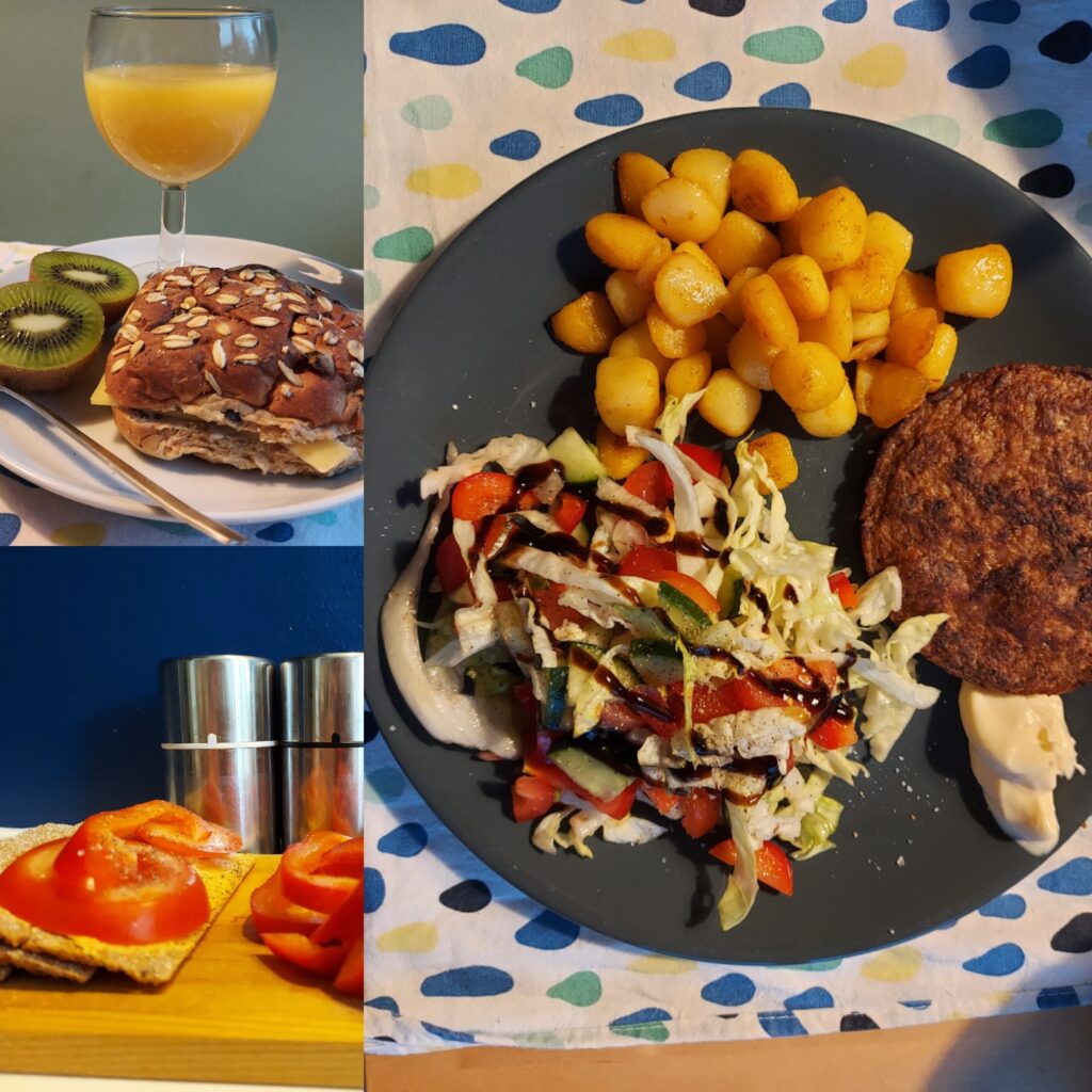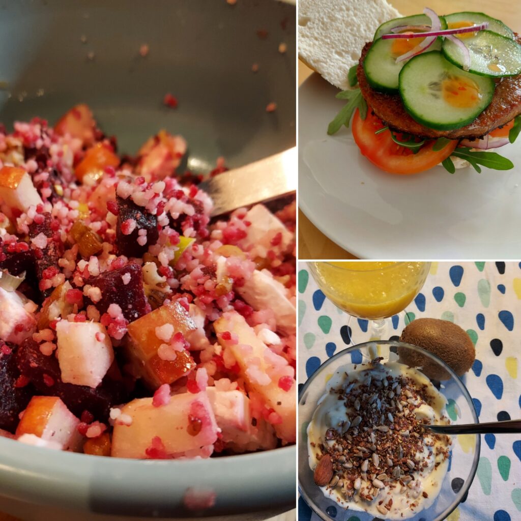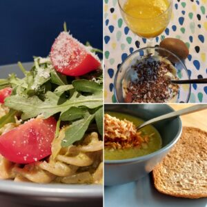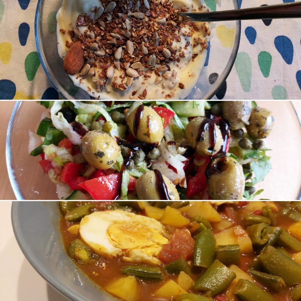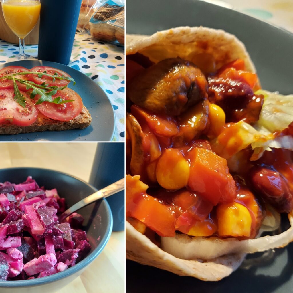 Volkoren warps met kidneybonen, groenten in tomatensaus en zure room